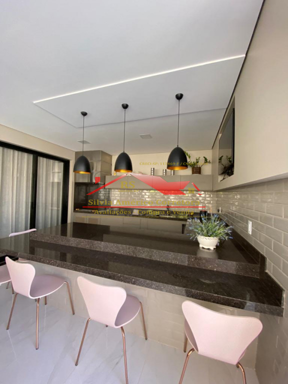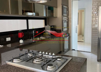 Cozinha toda planejada com pia em granito, balcão, acabamento fino e iluminação.